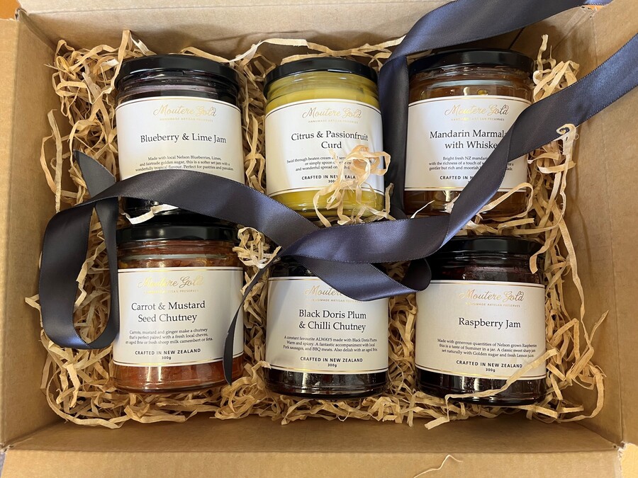 Gift a box of delicious Preserves and Chutneys. Moutere Gold products are made with local fruit, in small batches and no preservatives. They are full of flavour and will bring a nostalgic feeling of what was homemade to your friends and family. Something for everyone to enjoy and for different occasions. This gift is packed beautifully as a gift and we can pop in message in for you.